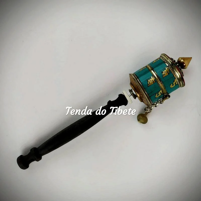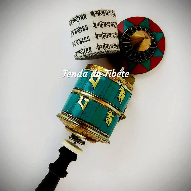 Esta peça tibetana budista da roda de oração, é feita de cobre turquesa.O mesmo é talhado com trabalho de filigrana fina, Roda de Oração filigrana de mão está coberta de Mantras. Tamanho aproximado 22 cm de comprimento e diâmetro de 5 cm.