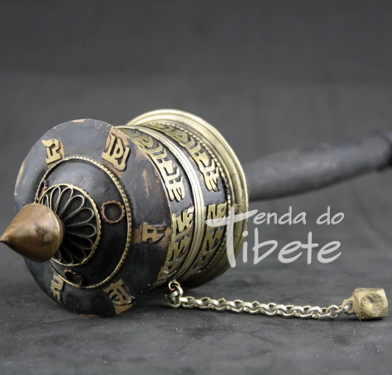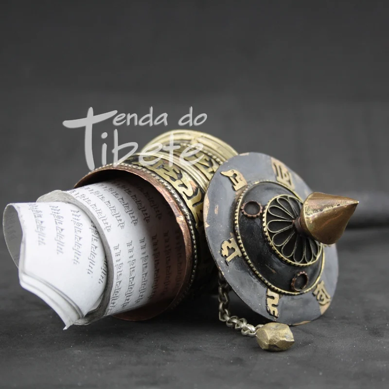Esta peça tibetana budista da roda de oração, é feita de cobre. Roda de Oração de mão está coberta de Mantras. Tamanho aproximado 22 cm de comprimento e diâmetro de 5 cm.