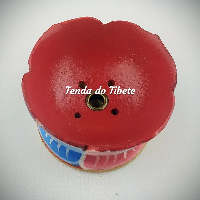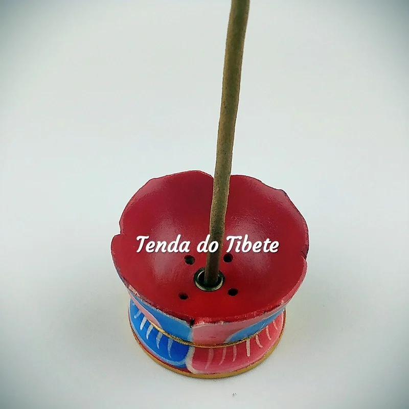 Queimador de incenso em madeira pintado; Este queimador de incenso tem duas vertentes para os incenso usuais de vareta, como para os incenso Tibetanos que são mais grossos e não têm vareta.