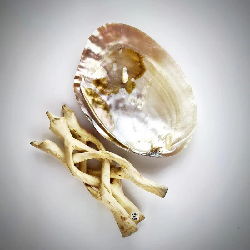 Este kit incluí o incenso de Sálvia Branca, uma concha em madre pérola, para queimar o aroma e um suporte para a concha.