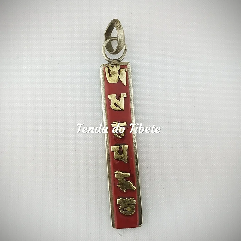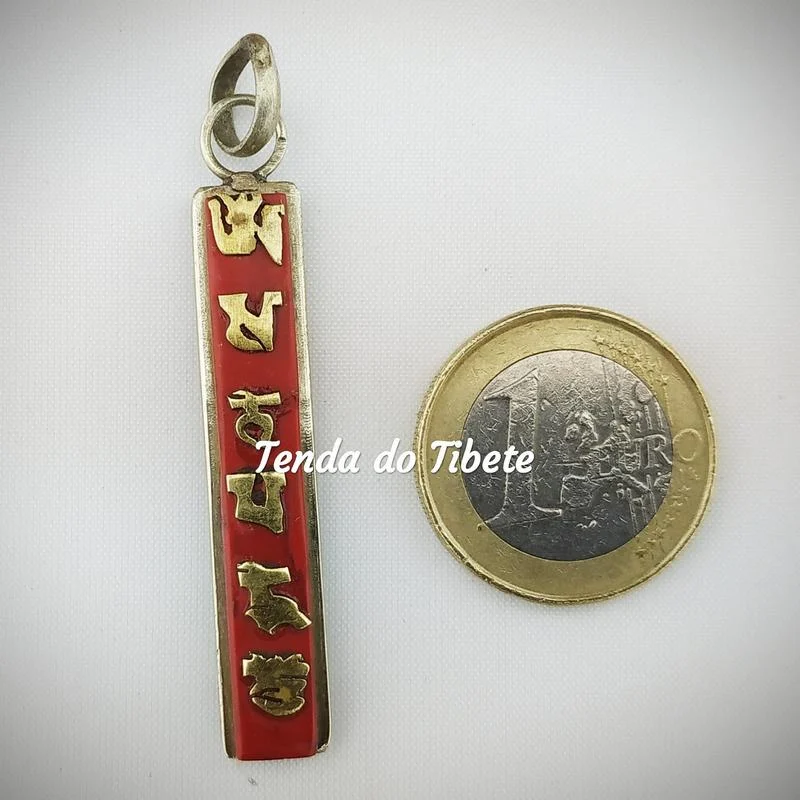 Pendente dupla face com o mantra Ommanipadmehum incrustado um lado Lapiz Lazuli e Coral no outro