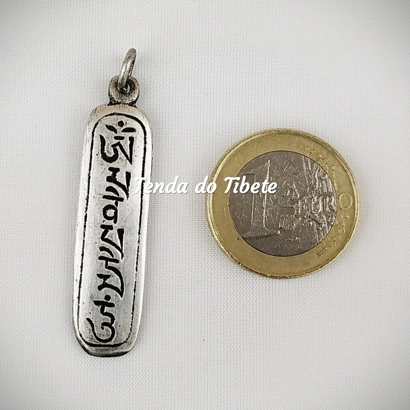 Pendente em metal com o mantra Om mani padme hum é um dos mantras do budismo; o mantra de seis sílabas do Bodisatva da compaixão: Avalokiteshvara. De origem indiana, de lá foi para o Tibete. O mantra é associado ao deus de 4 braços Shadakshari, uma das formas de Avalokiteshvara.