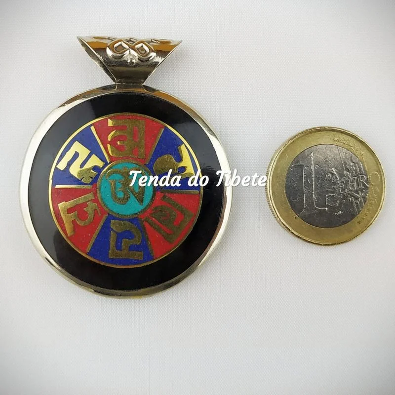 Este pendente tibetano artesanal, é feito por lapis, turquesa, coral e Metal. Aprox 4 cm de diâmetro.