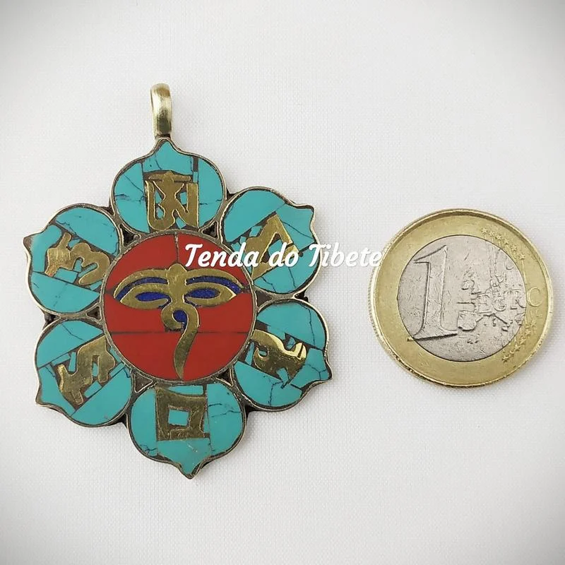 OM Mani Padme Hum Pendant com os olhos Stupa nepalês Em praticamente todos os stupa (templo budista) no Nepal,existem pares gigante de olhos fora das quatro faces da torre principal. Estes são os olhos de Buda (também conhecidos como olhos de sabedoria),e olham para fora nas quatro direcções para simbolizar a omnisciência (que tudo vê) de um Buda. Os olhos de Buda são tão prevalecente em todo o país que se tornaram um símbolo do Nepal em si. Entre os olhos de Buda,onde o nariz seria um símbolo encaracolado que parece ponto de interrogação. Este é o carácter Nepali para o número 1,que simboliza a união de todas as coisas,bem como a uma maneira de alcançar a iluminação,através de ensinamentos do Buda. Acima disso há um terceiro olho,que simboliza a sabedoria que tudo vê do Buda., o produto real pode variar ligeiramente em relação a imagem.