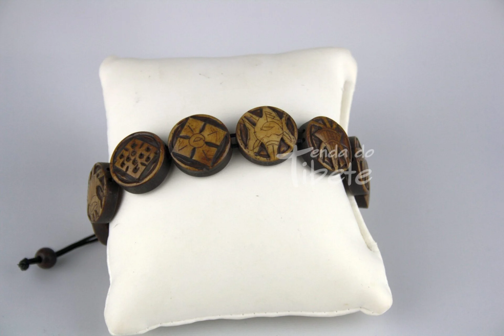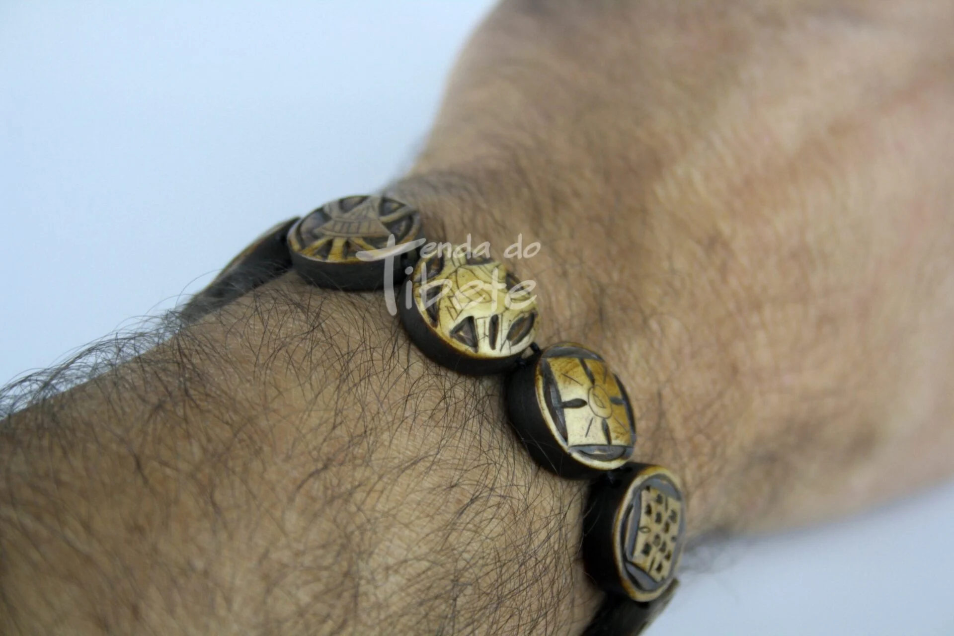 Pulseira em osso de Iaque,com cordão ajustável, gravado com os Oito Símbolos Auspiciosos.