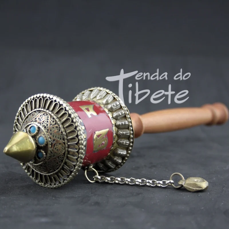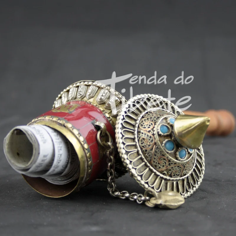 Esta peça tibetana budista da roda de oração, é feita de cobre e coral.O mesmo é talhado com trabalho de filigrana fina, Roda de Oração filigrana de mão está coberta de Mantras. Tamanho aproximado 22 cm de comprimento e diâmetro de 5 cm.