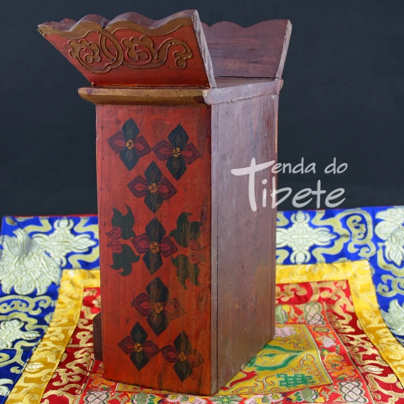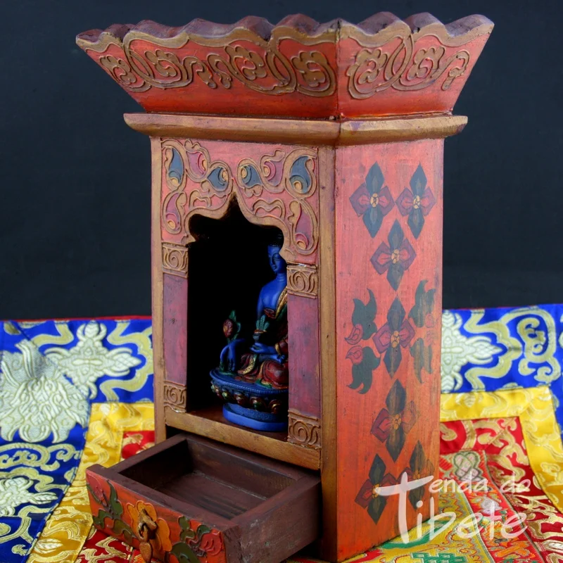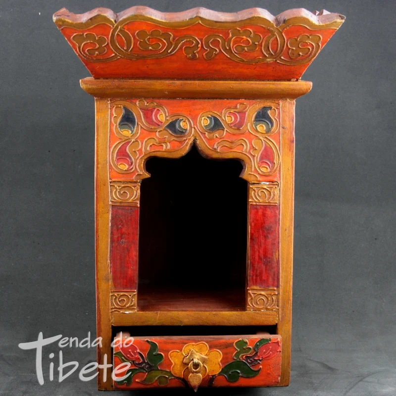Este bonito santuário de madeira, foi pintado por um grupo pequeno de artistas tibetanos. Daí que o produto é inteiramente feito à mão. Pode haver uma ligeira variação no tamanho e cores. Todas as medidas são aproximadas. Tamanho: Comprimento 12 cm X largura 21 cm X altura 30 cm. Por favor, note: santuário de madeira tibetano, não é vendido com estátua.