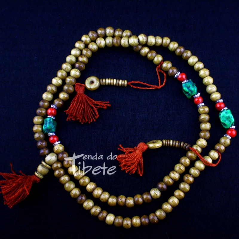 Este japamala de osso é um poderoso rosário budista tibetano de meditação, feita de osso de iaque, turquesa, e contas vermelhas.Este japamala oração (rosário) de 108 contas é indispensável para a prática meditativa. Cada conta é usado para contar a repetição de um mantra ou canto. O osso representa a terra e nossa conexão com ela e aumentar o prana(energia vital). A borla é feito de algodão. Há duas borlas com colares de contas de cada lado da mala com 10 contas de contagem de cada lado. Há também um cordão de guru no centro da mala. Tem 108 contas neste japamala.